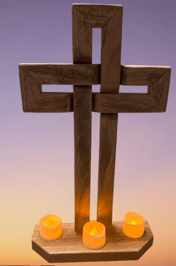 14 X 8 inch wood cross with three battery operated candles. Various stain and wood type options available. $40