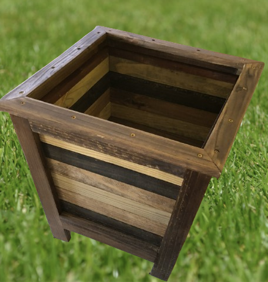 Planter box available in different sizes and stain or paint colors. Basic size has room for a liner inside of 14 X 14 inches at the top and 11 X 11 inch at the bottom with a height of 12 1/2 inches. Price for a basic box is $60.